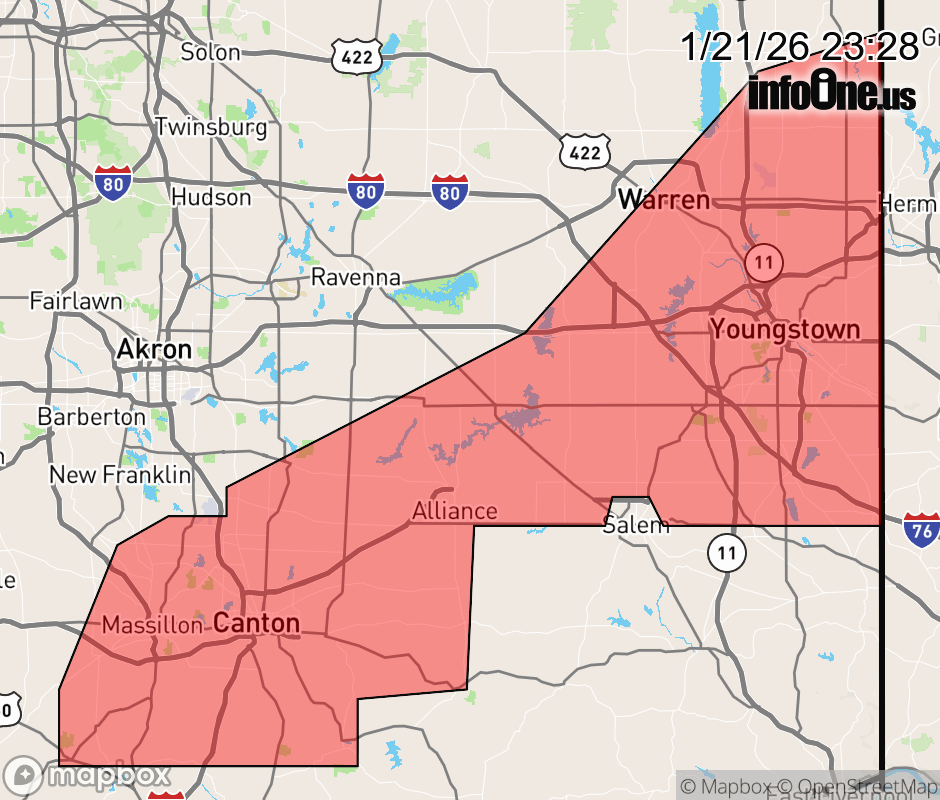 Canceled 1/22/26 12:30 AM Special Weather Statement issued January 21 at 11:26PM EST by NWS Cleveland OH At 1126 PM EST, radar indicated snow showers along a line extending from 6 miles northeast of Vienna Center to near Louisville to Brewster, moving east at 30 mph. HAZARDS INCLUDE... Winds to 30 mph... Visibility dropping to less than three quarters of a mile... Locations impacted include... Canton, Youngstown, Warren, Salem, Columbiana, Boardman, Massillon, Green, Alliance, Niles, North Canton, Louisville, Campbell, Hubbard, Canfield, Cortland, Sebring, Minerva, Lordstown, and Hartville. Use extra caution if you must travel. Rapid changes in visibility and potentially slick roads may lead to accidents. ![]() |
