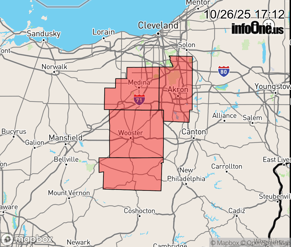 Canceled 10/26/25 10:21 PM Freeze Warning issued October 26 at 5:09PM EDT until October 27 at 9:00AM EDT by NWS Cleveland OH * WHAT... Sub-freezing temperatures as low as 26 expected. * WHERE... Holmes, Medina, Summit, and Wayne Counties. * WHEN... From midnight tonight to 9 AM EDT Monday. * IMPACTS... Frost and freeze conditions could kill crops, other sensitive vegetation and possibly damage unprotected outdoor plumbing. ![]() |