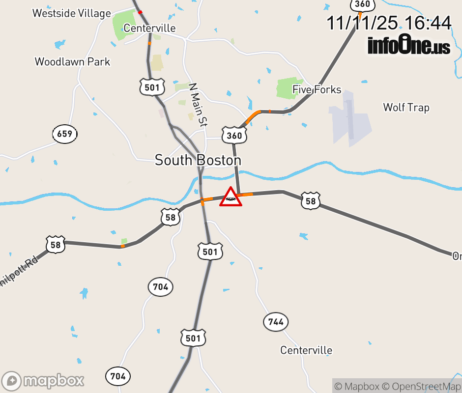 On US-58 East in the County of Halifax, in the vicinity of John Randolph Blvd; US-360E, motorists can expect delays due to a vehicle crash. Lane closures exist. ![]() |