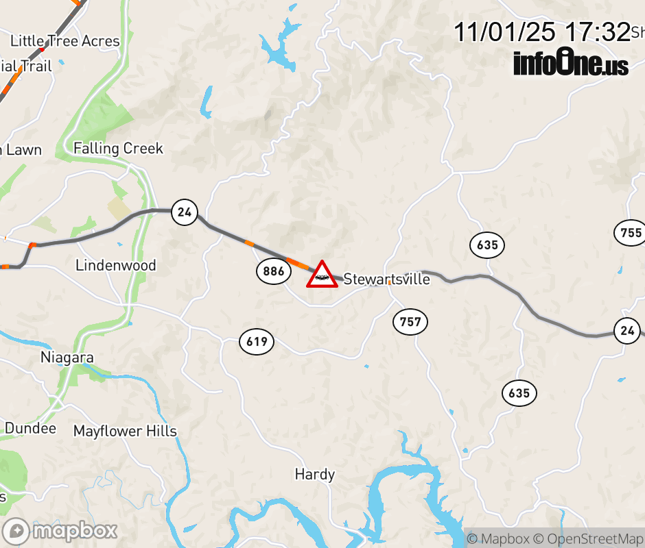 On VA-24 in the County of Bedford, in the vicinity of Cascade Dr; Rt. 1022E/W (Bedford County), motorists can expect delays due to a vehicle crash. The west right lane and right shoulder are closed. Updated: Sat 11/1/25 5:32 PM EDT ![]() Updated: Sat 11/1/25 5:32 PM EDT |