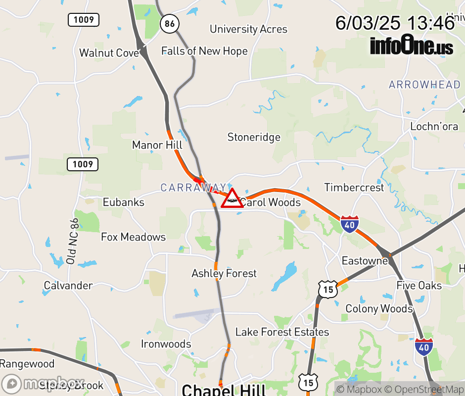 The right shoulder is closed near Exit 266 (NC 86) Updated: Tue 6/3/25 1:46 PM EDT ![]() Updated: Tue 6/3/25 1:46 PM EDT |