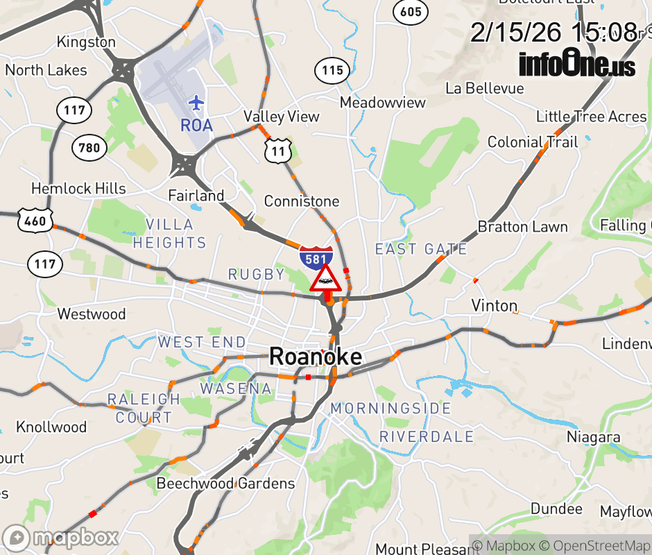 On I-581 at mile marker 1.4 in the County of Roanoke, motorists can expect delays due to a multi-vehicle crash. The north right shoulder is closed. Updated: Sun 2/15/26 3:08 PM EST ![]() Updated: Sun 2/15/26 3:08 PM EST |