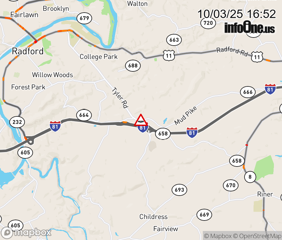 On Rt. 600 North in the County of Montgomery, in the vicinity of Tyler Rd; VA-177N; /MUD PIKE, motorists can expect delays due to a vehicle crash. Lane closures exist. ![]() |
