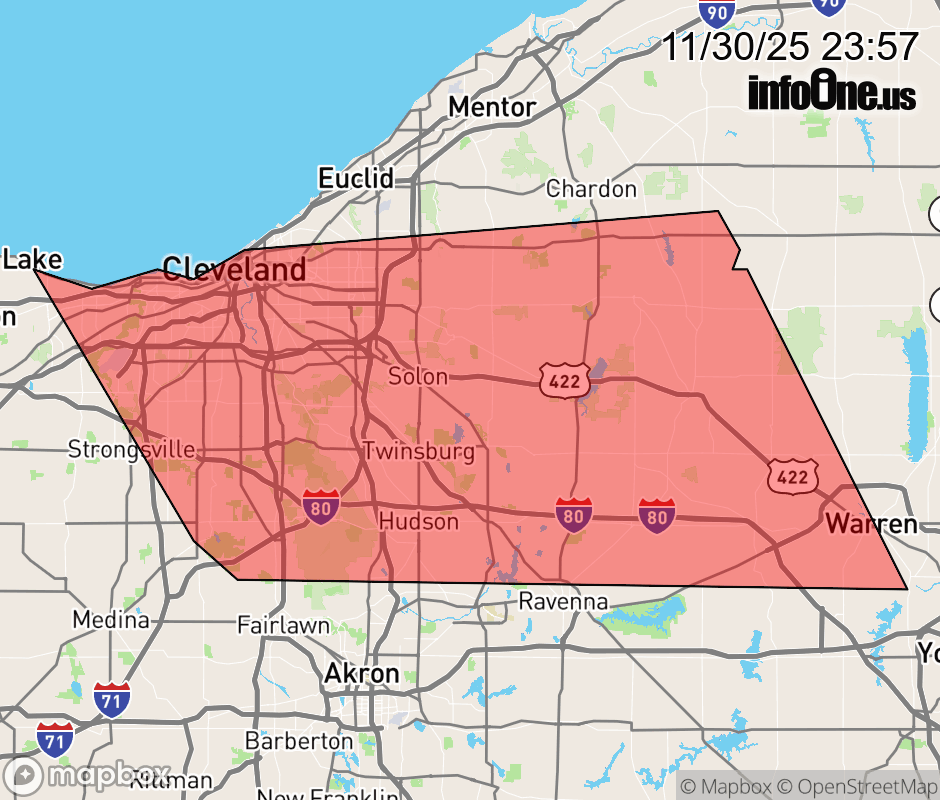 Canceled 12/1/25 1:00 AM Special Weather Statement issued November 30 at 11:56PM EST by NWS Cleveland OH At 1153 PM EST, radar indicated an intense lake effect snow band along a line extending from near West Farmington to near Lakewood, moving southeast at 20 mph. HAZARDS INCLUDE... Visibility rapidly dropping to less than a quarter of a mile... Up to 2 inches of quick snow accumulation... Locations impacted include... Cleveland, Warren, Ravenna, Parma, Lakewood, Cuyahoga Falls, Cleveland Heights, Strongsville, Brunswick, Westlake, North Royalton, Solon, Hudson, Niles, Twinsburg, Streetsboro, Warrensville Heights, Macedonia, Newton Falls, and South Russell. Use extra caution if you must travel into or through this lake effect snow band. Rapid changes in visibility and potentially slick roads are likely to lead to accidents. Consider delaying travel until this snow band passes your location. ![]() |