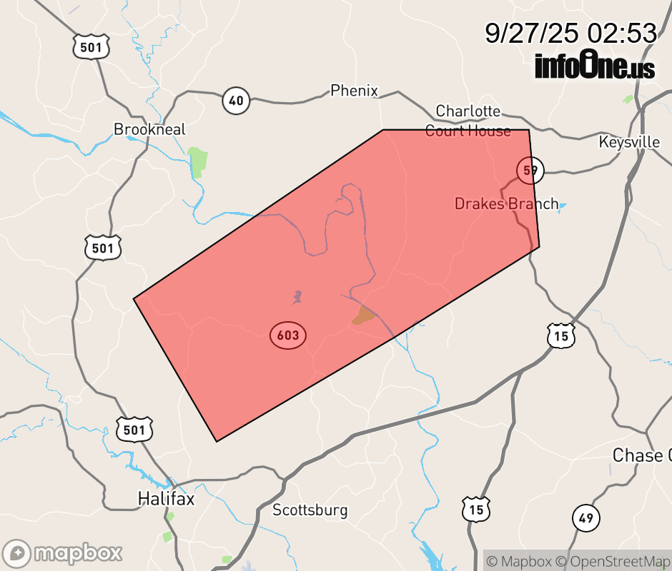 Canceled 9/27/25 5:17 AM Flood Advisory issued September 27 at 2:51AM EDT until September 27 at 8:00AM EDT by NWS Blacksburg VA * WHAT... Flooding caused by excessive rainfall is expected. * WHERE... A portion of south central Virginia, including the following counties, Charlotte and Halifax. * WHEN... Until 800 AM EDT. * IMPACTS... Minor flooding in low-lying and poor drainage areas. River or stream flows are elevated. * ADDITIONAL DETAILS... - At 249 AM EDT, Doppler radar indicated heavy rain due to thunderstorms. Minor flooding is ongoing or expected to begin shortly in the advisory area. Between 2 and locally 4 inches of rain have fallen. - This includes the following streams and drainages... Double Branch, Gilliam Branch, Ellis Creek, Difficult Creek, Buckskin Creek, Ash Camp Creek, Armistead Branch, East Prong Difficult Creek, Bush Ford Branch, Austin Creek, Horsepen Creek, Catawba Creek and Black Walnut Creek. Additional rainfall amounts up to 1 inch are expected over the area. This additional rain will result in minor flooding. - Some locations that will experience flooding include... Charlotte Court House... Nathalie... Drakes Branch... Mt Laurel... Saxe... Crystal Hill... - For flooding safety information, please visit http://www.weather.gov/safety/flood ![]() |