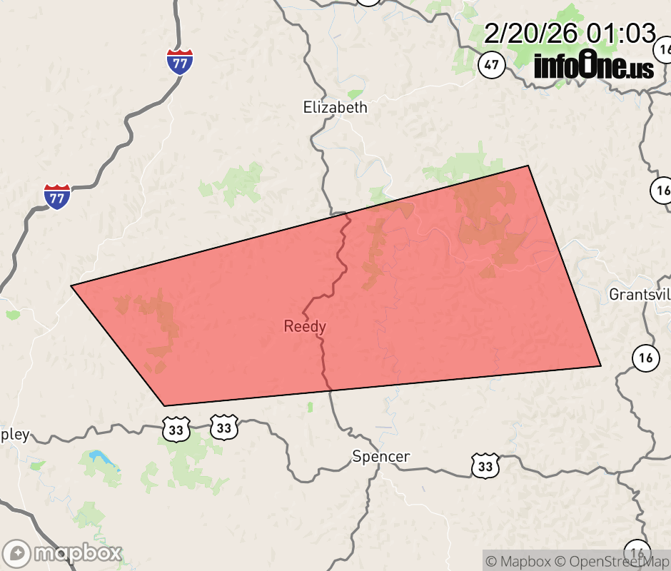 Canceled 2/20/26 1:09 AM Tornado Warning issued February 20 at 1:00AM EST until February 20 at 1:15AM EST by NWS Charleston WV TORRLX The National Weather Service in Charleston West Virginia has issued a * Tornado Warning for... Northwestern Calhoun County in north central West Virginia... Southern Wirt County in northwestern West Virginia... Northwestern Roane County in central West Virginia... East central Jackson County in northwestern West Virginia... * Until 115 AM EST. * At 100 AM EST, a severe thunderstorm capable of producing a tornado was located 7 miles east of Sandyville, or 11 miles northwest of Spencer, moving east at 50 mph. HAZARD...Tornado and quarter size hail. SOURCE...Radar indicated rotation. IMPACT...Flying debris will be dangerous to those caught without shelter. Mobile homes will be damaged or destroyed. Damage to roofs, windows, and vehicles will occur. Tree damage is likely. * This tornadic thunderstorm will remain over mainly rural areas of northwestern Calhoun, southern Wirt, northwestern Roane and east central Jackson Counties, including the following locations... Lucille, Peewee, Reedy, Creston, Annamoriah, Leroy, and Munday. ![]() |
