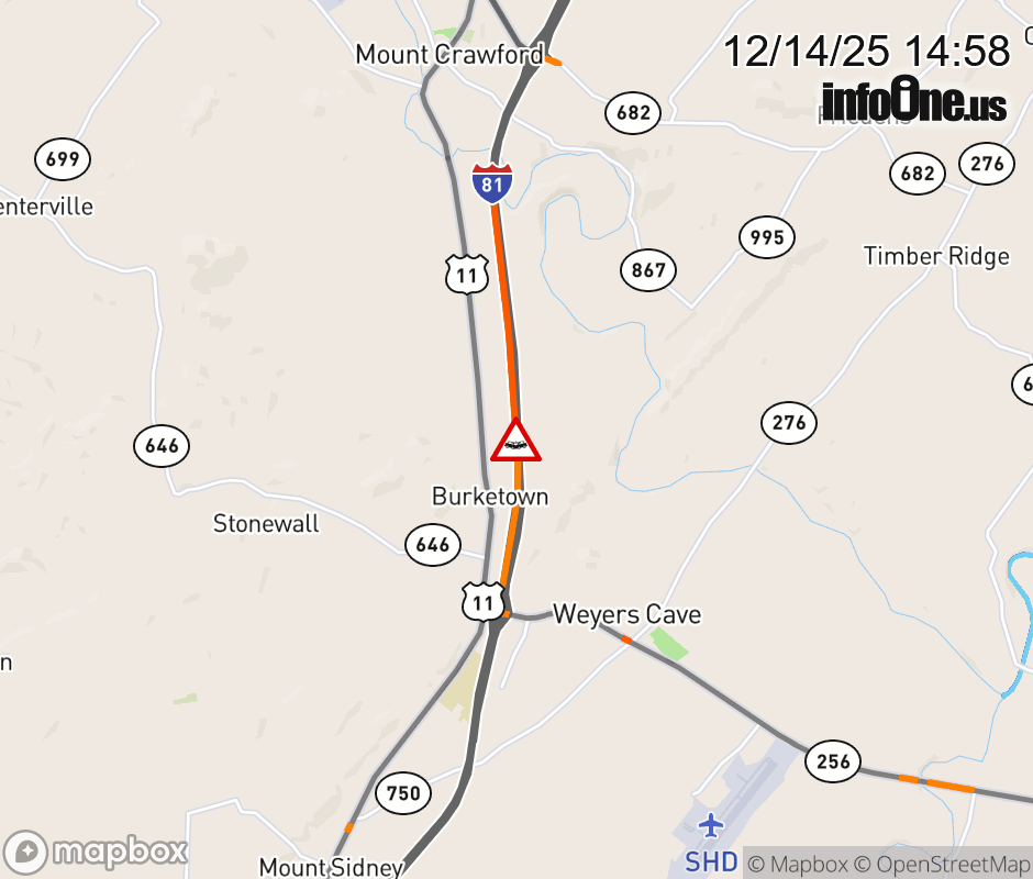 On I-81 at mile marker 236.7 in the County of Augusta, motorists can expect delays due to a tractor trailer crash. The south left shoulder is closed. Traffic backups are approximately 3.0 miles. Updated: Sun 12/14/25 2:58 PM EST ![]() Updated: Sun 12/14/25 2:58 PM EST |