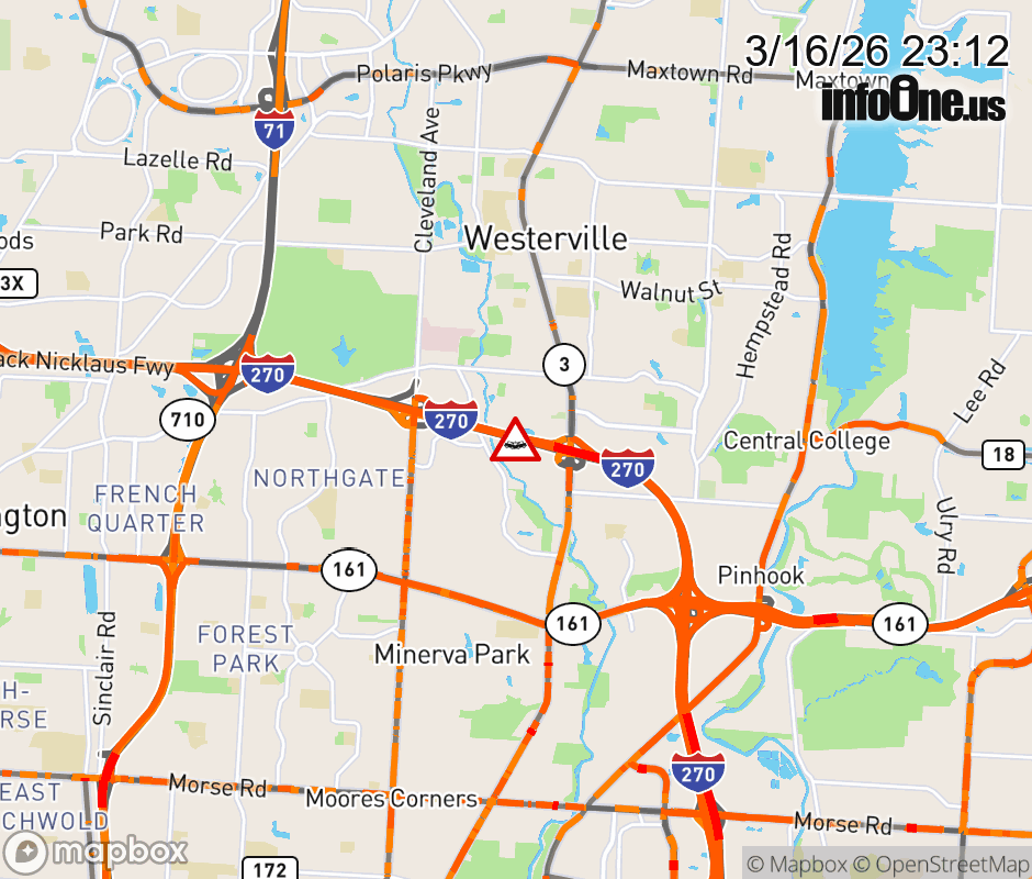The 2 left lanes are blocked on I-270 West at SR-3 the outer lanes are blocked on I-270 East at SR-3/Westerville Pike, due to a crash. ![]() |