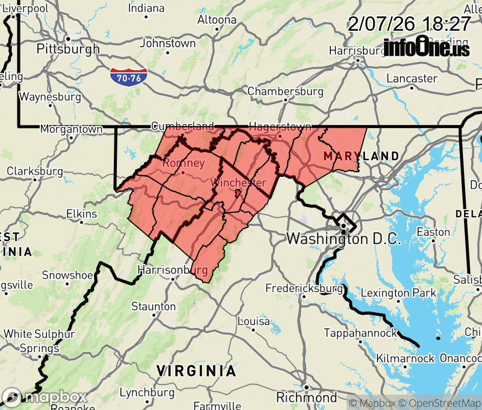 Canceled 2/7/26 10:06 PM Extreme Cold Warning issued February 7 at 6:25PM EST until February 8 at 10:00AM EST by NWS Baltimore MD/Washington DC * WHAT... For the Wind Advisory, northwest winds 20 to 30 mph with gusts up to 50 mph. For the Extreme Cold Warning, dangerously cold wind chills as low as 10 below zero in the valleys, and 20 below zero on the ridges. * WHERE... Portions of north central and western Maryland, northwest Virginia, and eastern and panhandle West Virginia. * WHEN... For the Wind Advisory, until 10 PM EST this evening. For the Extreme Cold Warning, until 10 AM EST Sunday. * IMPACTS... Gusty winds will blow around unsecured objects. Tree limbs could be blown down and a few power outages may result. The cold wind chills as low as 20 below zero could result in hypothermia if precautions are not taken. ![]() |