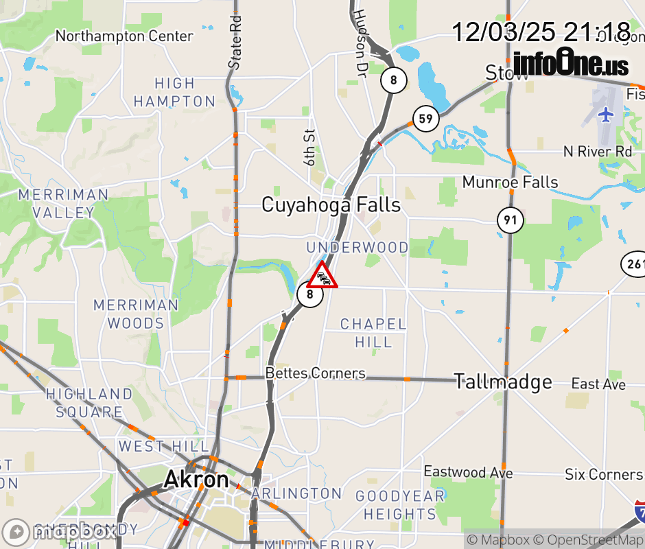 The 2 left lanes are blocked on SR-8 South/SR-59 West at Howe Ave/Cuyahoga Falls Ave, due to repairs/maintenance. Updated: Wed 12/3/25 9:18 PM EST ![]() Updated: Wed 12/3/25 9:18 PM EST |