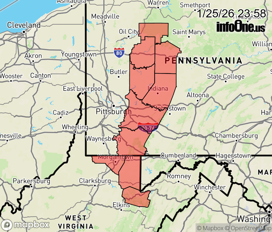 Canceled 1/26/26 5:34 AM Winter Storm Warning issued January 25 at 11:57PM EST until January 26 at 12:00PM EST by NWS Pittsburgh PA ...IMPACTS FROM MAJOR WINTER STORM ARE WINDING DOWN AS THE LOW PRESSURE SYSTEM DEPARTS, BUT HAZARDOUS TRAVEL CONDITIONS AND MINOR ADDITIONAL SNOW ACCUMULATION WILL CONTINUE THROUGH EARLY MONDAY... * WHAT... Mixed precipitation. Additional snow accumulations of 1 to 3 inches and ice accumulations around a light glaze. * WHERE... Portions of northwest, southwest, and western Pennsylvania and northern West Virginia. * WHEN... Until noon EST Monday. * IMPACTS... Roads, and especially bridges and overpasses, will likely become slick and hazardous. Plan on slippery road conditions. The hazardous conditions will impact the Monday morning commute. ![]() |