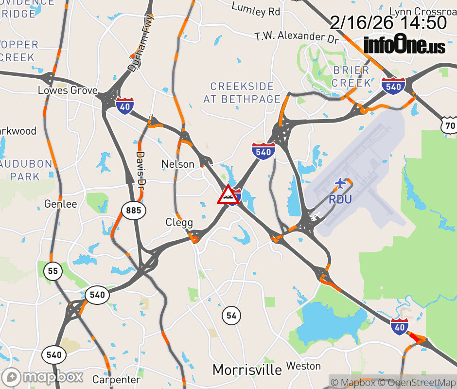 The right shoulder is closed on Exit 283A (I-540 E). Updated: Mon 2/16/26 2:50 PM EST ![]() Updated: Mon 2/16/26 2:50 PM EST |