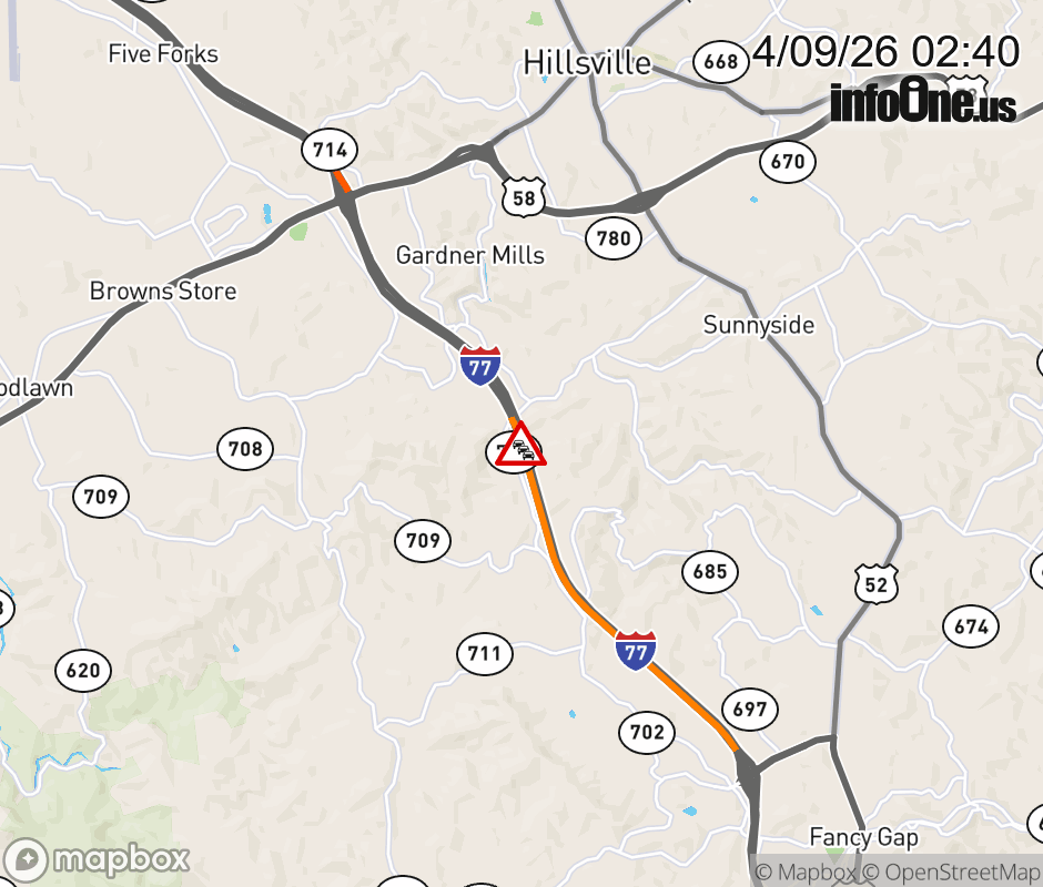 On I-77 at mile marker 12.3 in the County of Carroll, motorists can expect delays due to a vehicle fire. The south right lane and right shoulder are closed. Updated: Thu 4/9/26 2:40 AM EDT ![]() Updated: Thu 4/9/26 2:40 AM EDT |