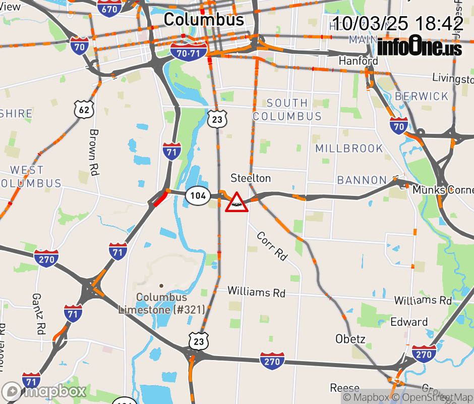 The right lane is blocked on SR-104 West at US-23/High St, due to a crash. ![]() |