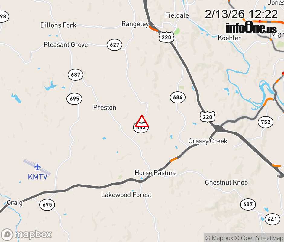 On Rt. 683 in the County of Henry, in the vicinity of Green Acres Cir; Tanyard Rd; Rt. 859E/W (Henry County), motorists can expect delays due to a vehicle crash. All north lanes are closed. All south lanes are closed. Updated: Fri 2/13/26 12:22 PM EST ![]() Updated: Fri 2/13/26 12:22 PM EST |