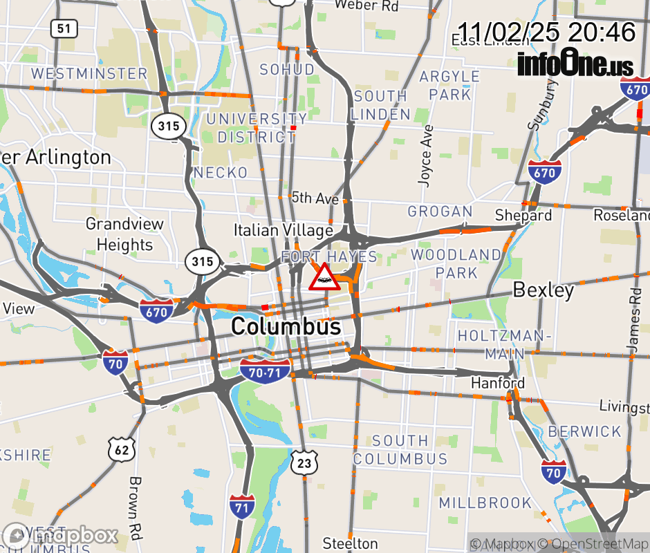 The right lane is closed on Ramp I-670 East to I-71 North, due to a crash. Updated: Sun 11/2/25 8:46 PM EST ![]() Updated: Sun 11/2/25 8:46 PM EST |