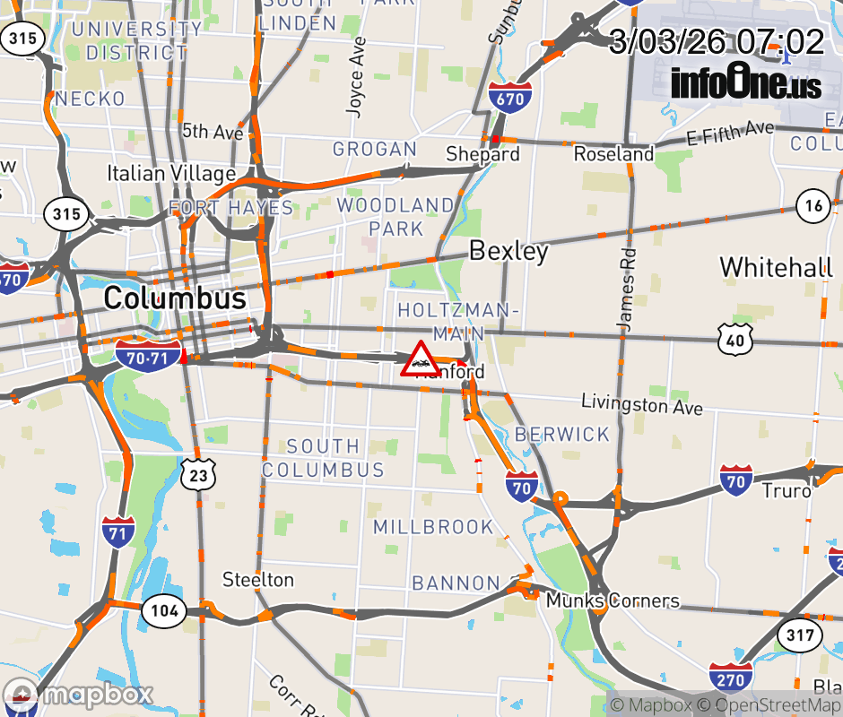 The right shoulder is blocked on I-70 West at Kelton Ave/Miller Ave, due to a disabled vehicle. Updated: Tue 3/3/26 7:02 AM EST ![]() Updated: Tue 3/3/26 7:02 AM EST |