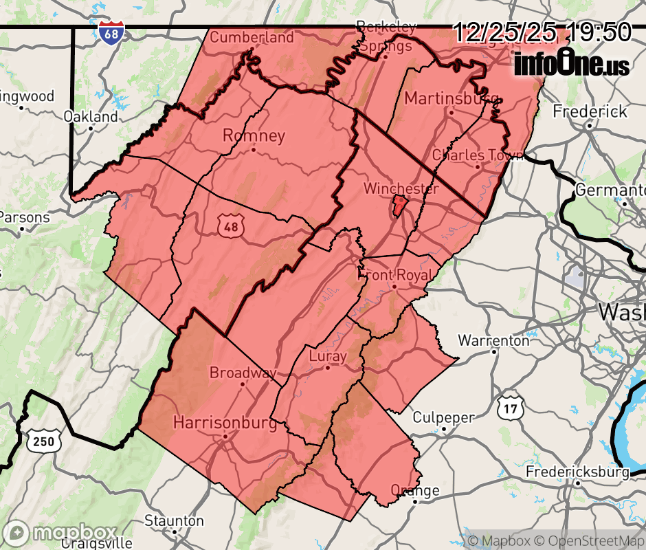 Canceled 12/26/25 3:05 AM Winter Weather Advisory issued December 25 at 7:49PM EST until December 26 at 11:00PM EST by NWS Baltimore MD/Washington DC ...A MIXTURE OF FREEZING RAIN AND SLEET TO OVERSPREAD AREAS NORTH OF I-66/U.S. 50 ON FRIDAY... .As high pressure builds across Quebec, a steady stream of cold air will funnel southward into the Mid-Atlantic region. At the same time, moisture will overrun a frontal boundary across the central Appalachians down into the Carolinas. As milder air will settle above the sub-freezing surface layer, a wintry mix consisting of freezing rain and sleet is likely over portions of the area. Travel impacts are likely where the wintry mix falls. * WHAT... Mixed precipitation expected. Total snow and sleet accumulations up to one inch and ice accumulations around one tenth of an inch, with closer to a trace to a few hundredths of an inch near U.S. 50. * WHERE... Portions of north-central and western Maryland, northwest Virginia, and eastern West Virginia. * WHEN... From 10 AM to 11 PM EST Friday. * IMPACTS... Plan on slippery road conditions. The hazardous conditions will impact the Friday evening commute. * ADDITIONAL DETAILS... Precipitation is likely to overspread the area late Friday morning in the form of sleet or freezing rain. Freezing rain with some sleet mixing in will continue through the afternoon and evening. Through the day, temperatures are expected to remain close to 32 degrees before warming above freezing during the overnight hours. ![]() |