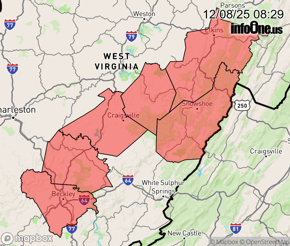 Canceled 12/8/25 11:51 AM Winter Weather Advisory issued December 8 at 8:28AM EST until December 8 at 9:00PM EST by NWS Charleston WV * WHAT... Snow. Additional snow accumulations between 1 and 3 inches. * WHERE... Portions of northeast and southeast West Virginia. * WHEN... Until 9 PM EST this evening. * IMPACTS... Roads, and especially bridges and overpasses, will likely become slick and hazardous. Plan on slippery road conditions. The hazardous conditions could impact the Monday evening commute. ![]() |