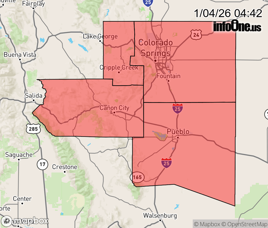 Canceled 1/4/26 4:09 PM Red Flag Warning issued January 4 at 2:40AM MST until January 4 at 5:00PM MST by NWS Pueblo CO ...A Red Flag Warning is in effect for portions of the area from 10 AM through 5 PM Sunday... ...A Fire Weather Watch has been issued for portions of the area from late Monday Morning through Monday afternoon... * AFFECTED AREA... Fire Weather Zones 221, 222, 226, 227 and 228. * WINDS... Southwest 10 to 20 mph with gusts up to 40 mph. * RELATIVE HUMIDITY... As low as 12 percent. * IMPACTS... Fires will catch and spread quickly. Exercise extreme caution with any outdoor burning. ![]() |