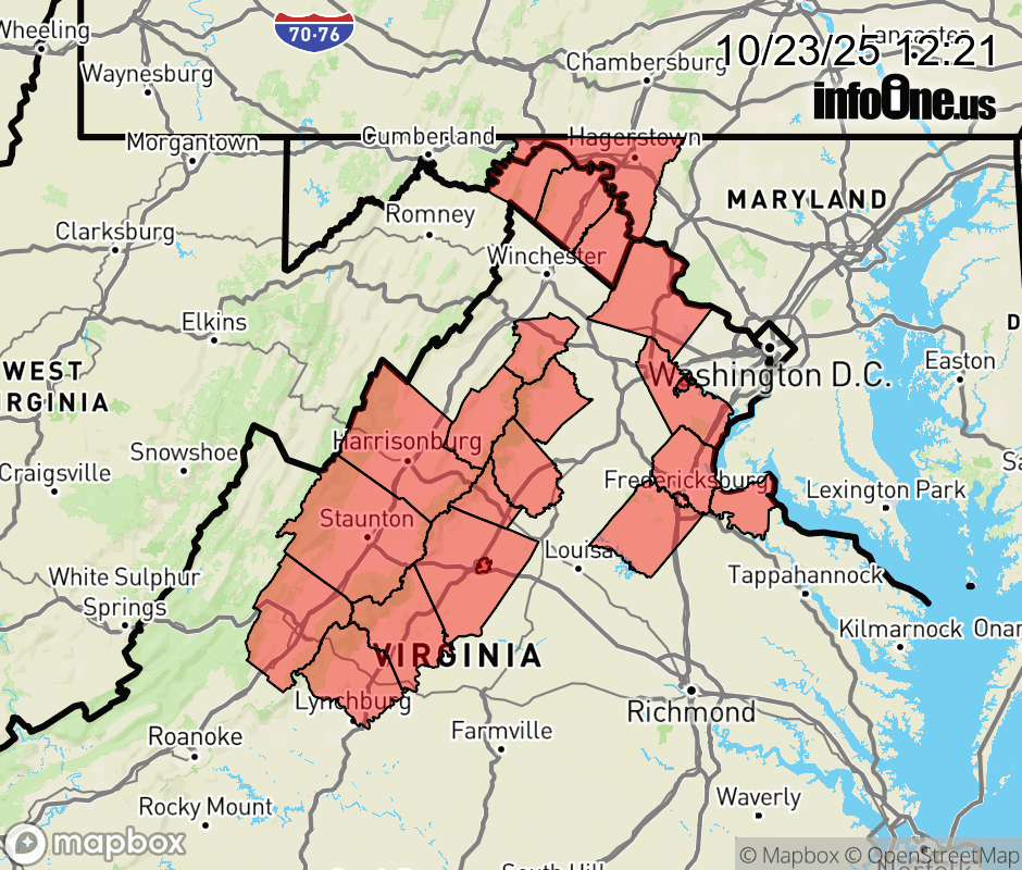 Canceled 10/23/25 8:04 PM Frost Advisory issued October 23 at 12:18PM EDT until October 24 at 9:00AM EDT by NWS Baltimore MD/Washington DC * WHAT... Temperatures as low as 33 will result in frost formation. * WHERE... Portions of north central Maryland, central, northern, and northwest Virginia, and the eastern panhandle of West Virginia. * WHEN... From 2 AM to 9 AM EDT Friday. * IMPACTS... Frost could harm sensitive outdoor vegetation. Sensitive outdoor plants may be killed if left uncovered. ![]() |