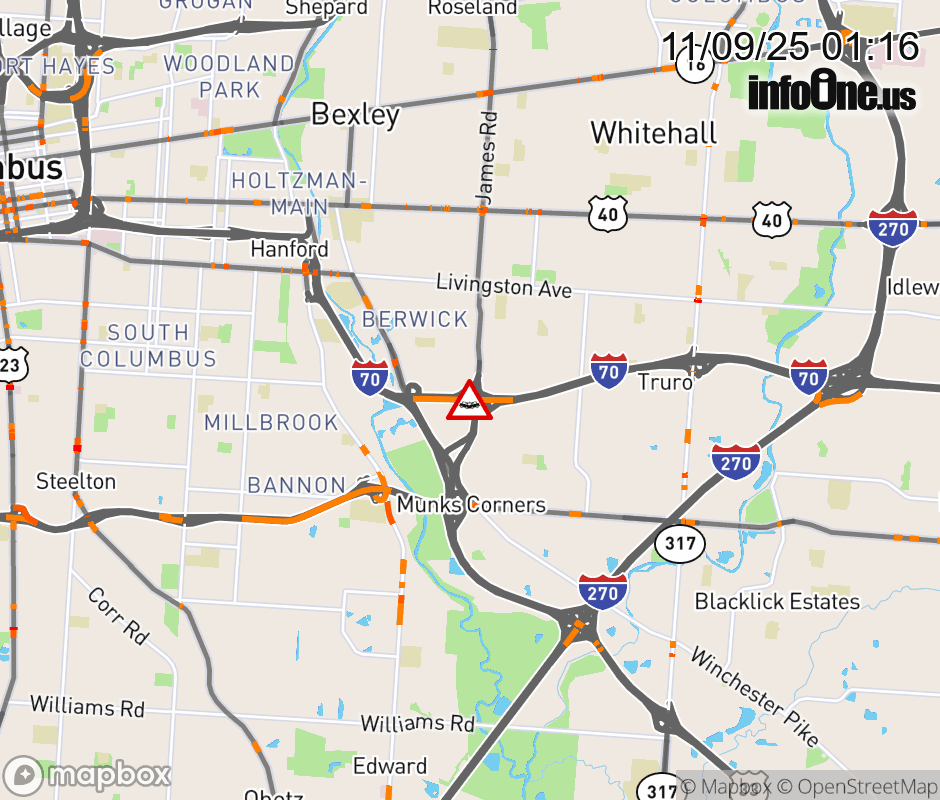 The left lane is blocked on I-70 East at James Rd, due to a crash. Updated: Sun 11/9/25 1:16 AM EST ![]() Updated: Sun 11/9/25 1:16 AM EST |