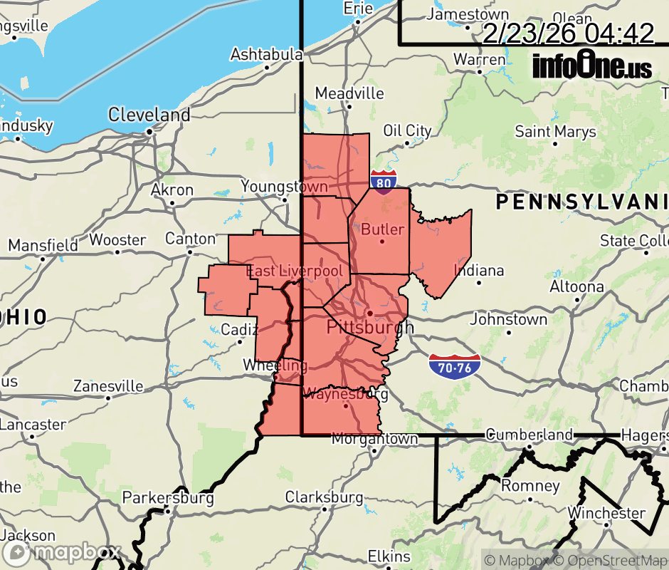 Canceled 2/23/26 9:00 AM Special Weather Statement issued February 23 at 4:41AM EST by NWS Pittsburgh PA Persistent snow showers across the region this morning are expected to continue through the morning commute reducing visibility and creating slick spots. Slick spots and light accumulations on roadways will be most likely on side roads and elevated surfaces such as bridges and overpasses. Care should be taken to slow down and increase following distance during the Monday morning commute. ![]() |