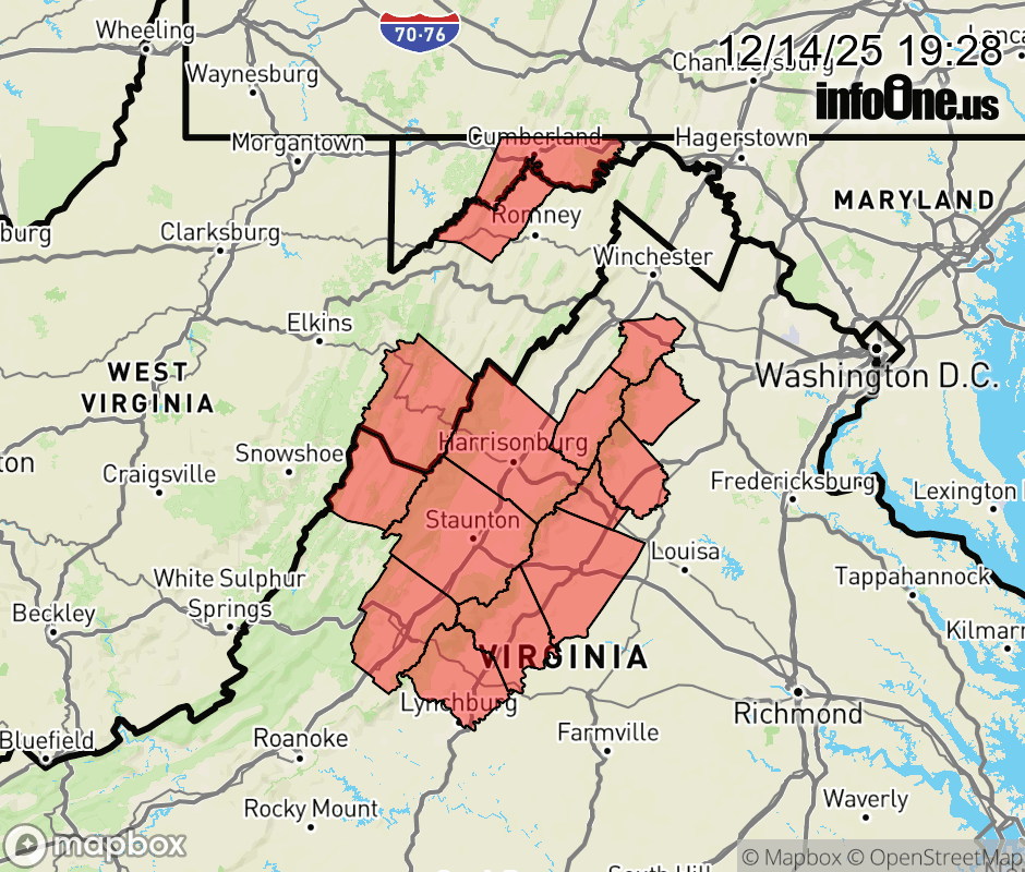 Canceled 12/15/25 3:32 AM Cold Weather Advisory issued December 14 at 7:26PM EST until December 15 at 7:00AM EST by NWS Baltimore MD/Washington DC * WHAT... Very cold wind chills between 10 and 20 below zero. * WHERE... In Maryland, Extreme Western Allegany County. In Virginia, Central Virginia Blue Ridge and Northern Virginia Blue Ridge, and Eastern Highland County. In West Virginia, Eastern Pendleton and Western Mineral Counties. * WHEN... Until 7 AM EST Monday. * IMPACTS... The cold wind chills approaching 20 below zero could cause hypothermia and frostbite on exposed skin in as little as 30 minutes. ![]() |