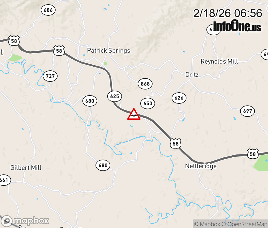 On US-58 in the County of Patrick, in the vicinity of S Fork Loop; Rt. 653N/S (Patrick County), motorists can expect delays due to a vehicle crash. The east right lane and right shoulder are closed. ![]() |