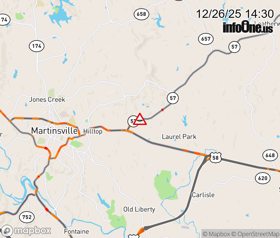On VA-57 East in the County of Henry, in the vicinity of Mount Olivet Rd; Rt. 777N/S (Henry County), motorists can expect delays due to a vehicle crash. Lane closures exist. ![]() |