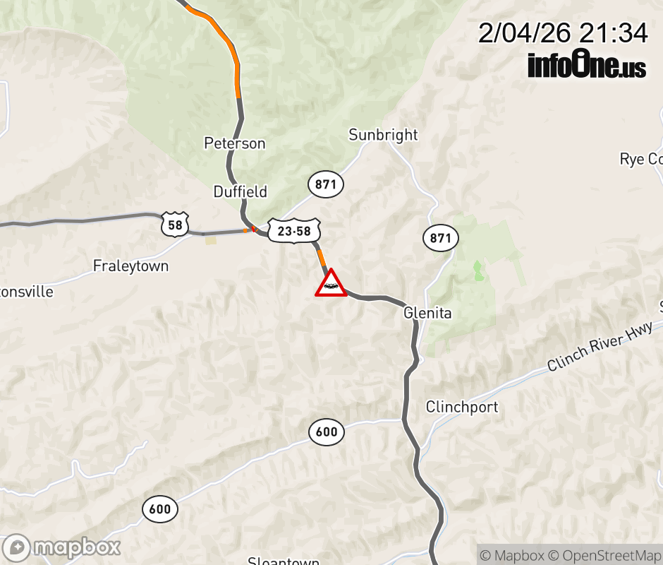 On US-23 in the County of Scott, in the vicinity of Rt. 873E/W (Scott County), motorists can expect delays due to a tractor trailer crash. The north right lane and right shoulder are closed. ![]() |