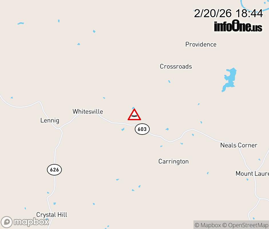 On Rt. 623 in the County of Halifax, in the vicinity of Hunting Creek Rd; Rt. 603E/W (Halifax County), motorists can expect delays due to a tractor trailer crash. All east lanes are closed. All west lanes are closed. Updated: Fri 2/20/26 6:44 PM EST ![]() Updated: Fri 2/20/26 6:44 PM EST |