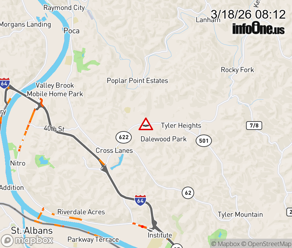Vehicle Crash on WV-622 (Big Tyler Rd) & Carleton Ct in Cross Lanes. The northbound road is closed. Updated: Wed 3/18/26 8:12 AM EDT ![]() Updated: Wed 3/18/26 8:12 AM EDT |