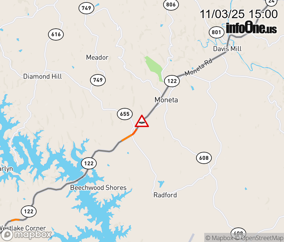 On VA-122 North in the County of Bedford, in the vicinity of Diamond Hill Rd; Rt. 655E (Bedford County); / DIAMOND HILL RD, motorists can expect delays due to a vehicle crash. Lane closures exist. ![]() |
