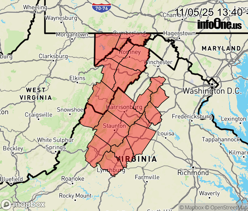 Canceled 11/5/25 7:03 PM Wind Advisory issued November 5 at 1:39PM EST until November 6 at 1:00AM EST by NWS Baltimore MD/Washington DC * WHAT... West winds 20 to 30 mph with gusts up to 50 mph expected. * WHERE... Portions of western Maryland, central, northwest, and western Virginia, and eastern West Virginia. * WHEN... Until 1 AM EST Thursday. * IMPACTS... Gusty winds will blow around unsecured objects. Tree limbs could be blown down and a few power outages may result. ![]() |