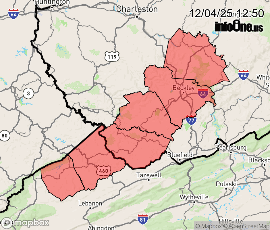 Canceled 12/4/25 7:45 PM Winter Weather Advisory issued December 4 at 12:48PM EST until December 5 at 10:00AM EST by NWS Charleston WV * WHAT... Snow expected. Total snow accumulations between 2 and 4 inches. * WHERE... Portions of southwest Virginia and southeast and southern West Virginia. * WHEN... From 7 PM this evening to 10 AM EST Friday. * IMPACTS... Plan on slippery road conditions. The hazardous conditions could impact the Friday morning commute. ![]() |