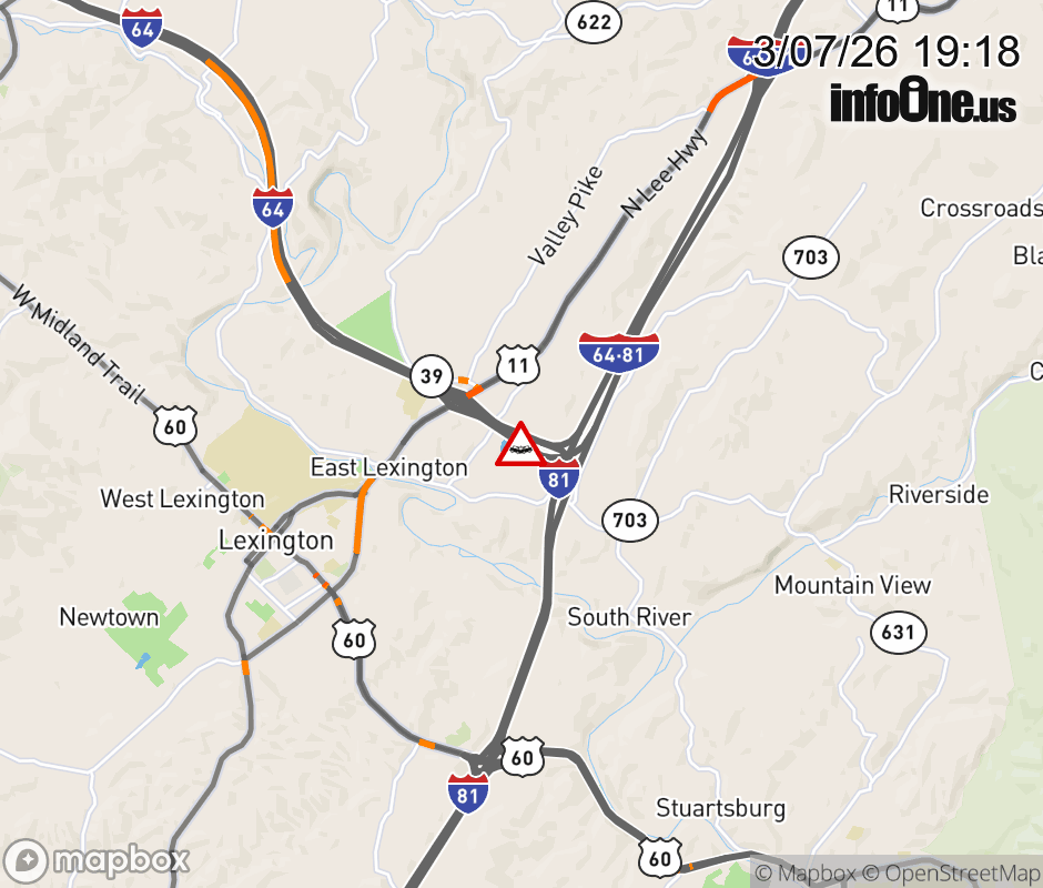 On I-64 at mile marker 56.5 in the County of Rockbridge, motorists can expect delays due to a vehicle crash. The east exit ramp narrows. ![]() |