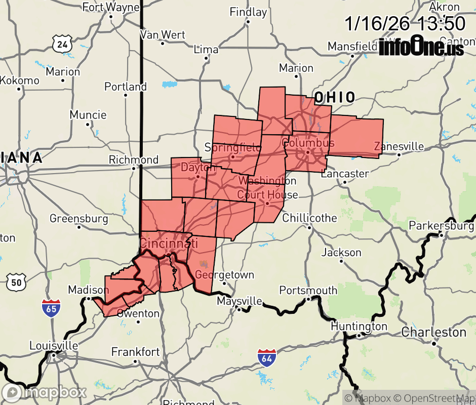 Canceled 1/16/26 9:00 PM Special Weather Statement issued January 16 at 1:48PM EST by NWS Wilmington OH Periods of light snow will develop late this evening and continue past midnight. Accumulations of an inch or two along with cooling pavement temperatures will result in slippery roadways... particularly on untreated roads and overpasses. If traveling, allow for some extra time to reach your destination and be prepared for wintery driving conditions. ![]() |