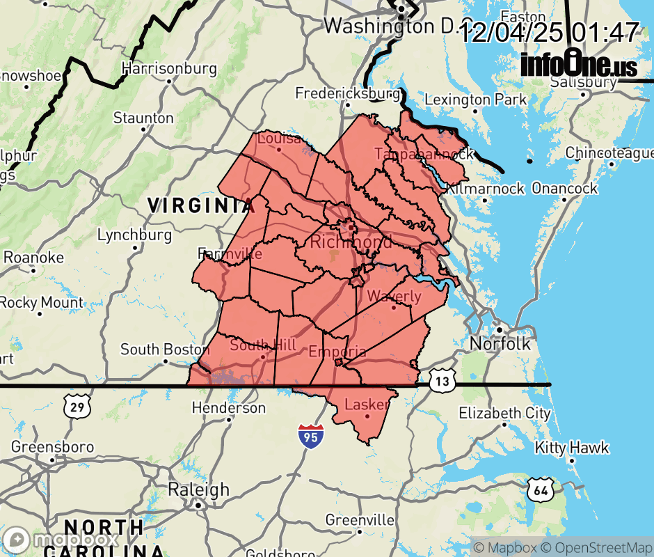 Canceled 12/4/25 9:52 AM Winter Weather Advisory issued December 4 at 1:46AM EST until December 6 at 1:00AM EST by NWS Wakefield VA * WHAT... Snow and mixed precipitation expected. Total snow accumulations of one to two inches with a light glaze of ice accumulation. * WHERE... Portions of northeast North Carolina and central, east central, north central, south central, and southeast Virginia. * WHEN... From 1 AM Friday to 1 AM EST Saturday. * IMPACTS... Plan on slippery road conditions. The hazardous conditions could impact the Friday morning and evening commutes. ![]() |