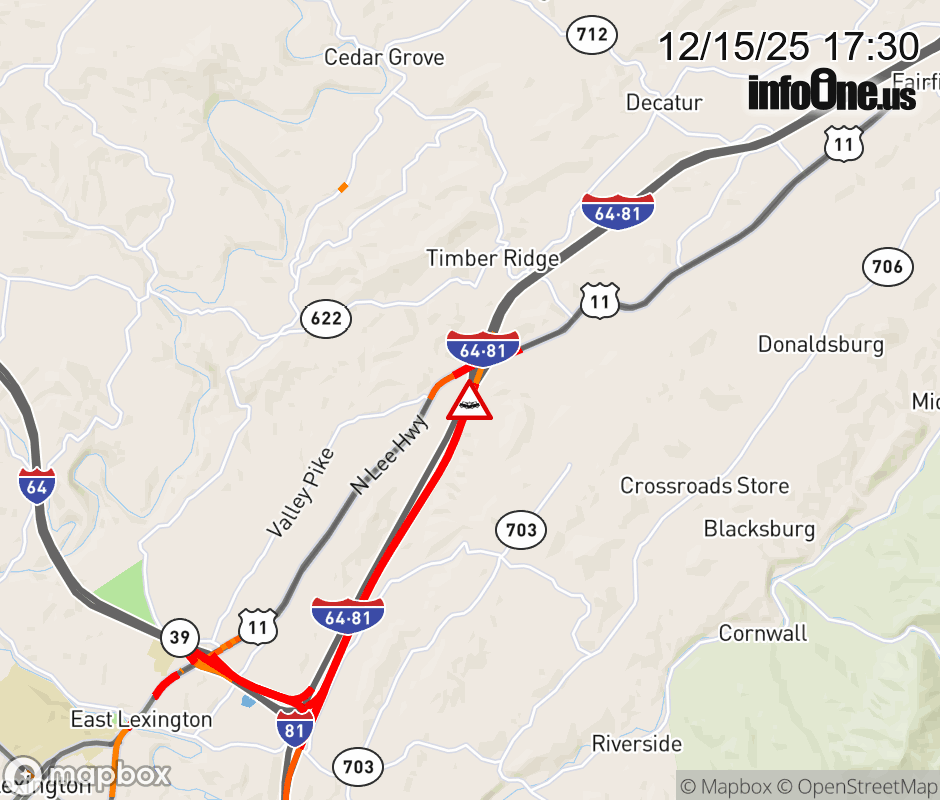 On I-81 North at mile marker 194.7 in the County of Rockbridge, motorists can expect delays due to a tractor trailer crash. Traffic backups are approximately 4.0 miles. Updated: Mon 12/15/25 5:30 PM EST ![]() Updated: Mon 12/15/25 5:30 PM EST |