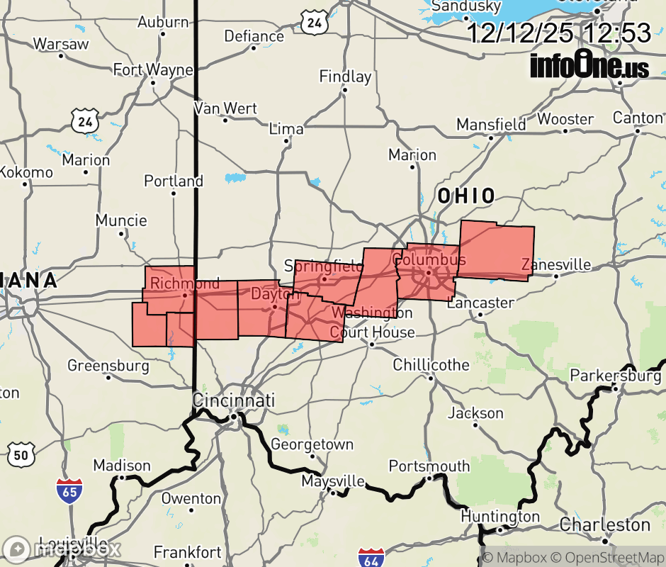 Canceled 12/12/25 8:07 PM Winter Weather Advisory issued December 12 at 12:51PM EST until December 14 at 7:00AM EST by NWS Wilmington OH * WHAT... Snow expected. Total snow accumulations between 3 and 5 inches. * WHERE... In Indiana, Fayette, Union, and Wayne Counties. In Ohio, Franklin, Licking, Madison, Clark, Greene, Montgomery, and Preble Counties. * WHEN... From 1 PM Saturday to 7 AM EST Sunday. * IMPACTS... Plan on slippery road conditions. ![]() |