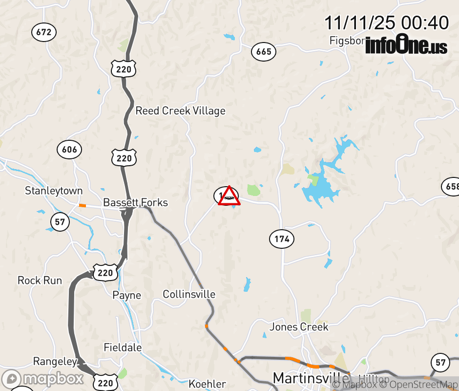 On VA-174 East in the County of Henry, in the vicinity of Rt. 1172N/S (Henry County), motorists can expect delays due to a vehicle crash. Lane closures exist. ![]() |
