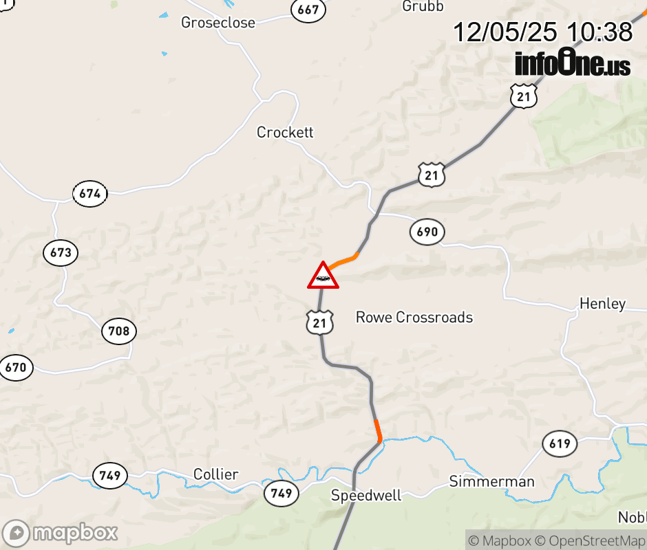 On US-21 in the County of Wythe, in the vicinity of Spraker Rd; Rt. 651E/W (Wythe County), motorists can expect delays due to a vehicle crash. All north lanes are closed. All south lanes are closed. ![]() |