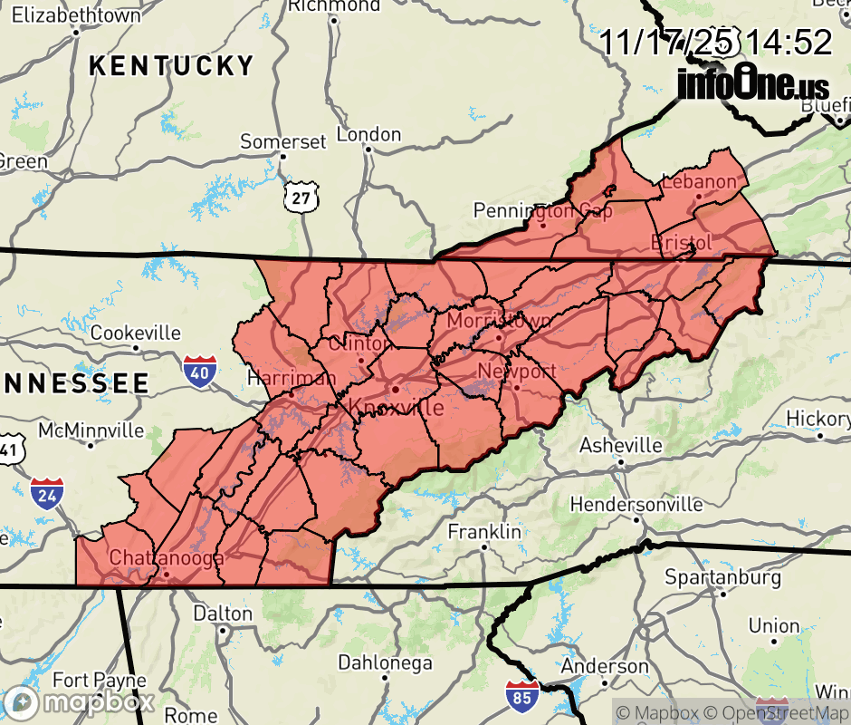 Canceled 11/18/25 6:00 PM Special Weather Statement issued November 17 at 2:49PM EST by NWS Morristown TN The combination of gusty winds and low afternoon relative humidities will lead to an elevated fire risk on Tuesday. Sustained south-southwest winds from 10 to 15 mph with gusts up to 25 mph are expected during the afternoon hours. Relative humidities will range from the upper 20s to mid 30s. These conditions could allow for fires to become uncontrolled. Please refer to your local burn permitting authorities on whether you can burn on Tuesday. Use extreme caution when burning as fires may get out of hand quickly in these conditions. ![]() |