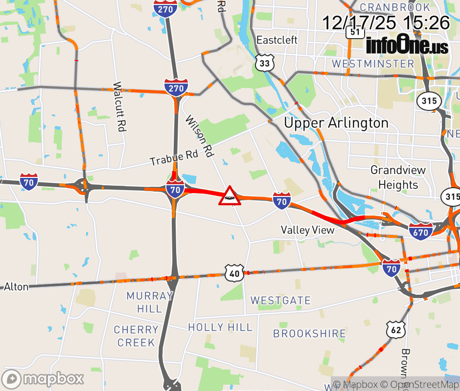 The right shoulder is blocked on I-70 West beyond Wilson Rd, due to a crash. Updated: Wed 12/17/25 3:26 PM EST ![]() Updated: Wed 12/17/25 3:26 PM EST |