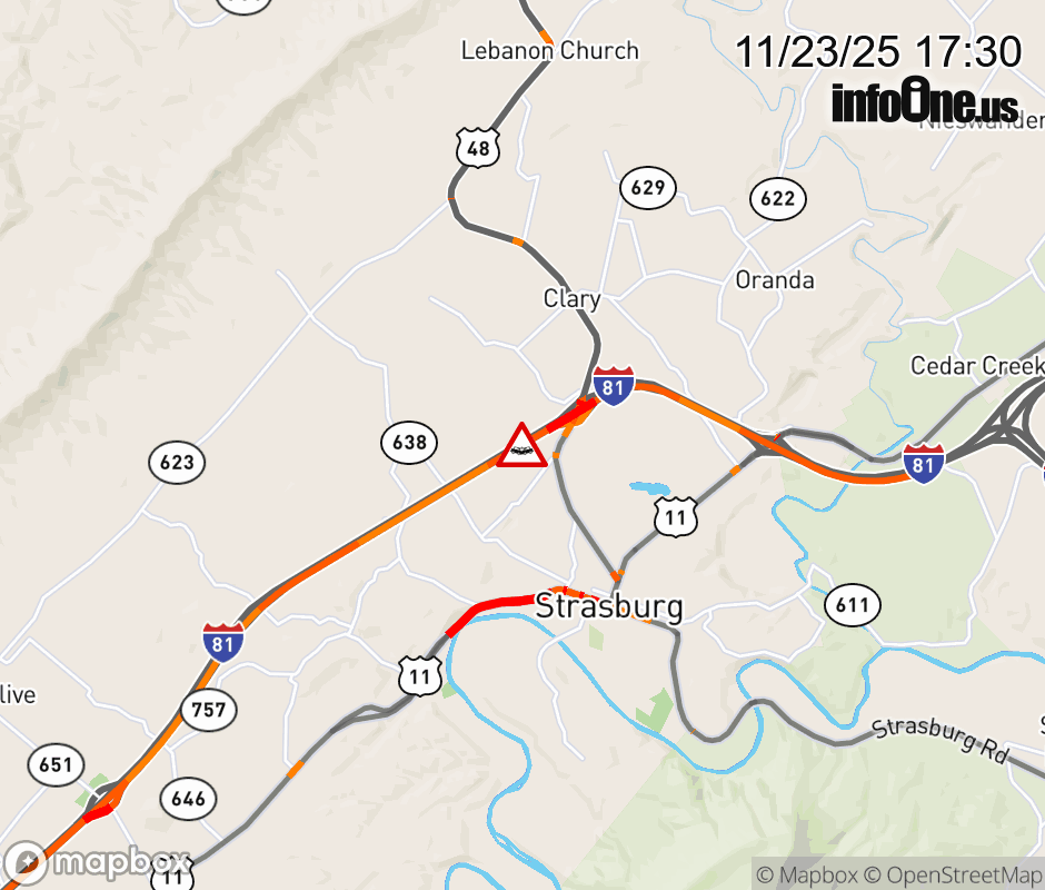 On I-81 at mile marker 296 in the County of Shenandoah, motorists can expect delays due to a multi-vehicle crash. The north right shoulder is closed. Updated: Sun 11/23/25 5:30 PM EST ![]() Updated: Sun 11/23/25 5:30 PM EST |