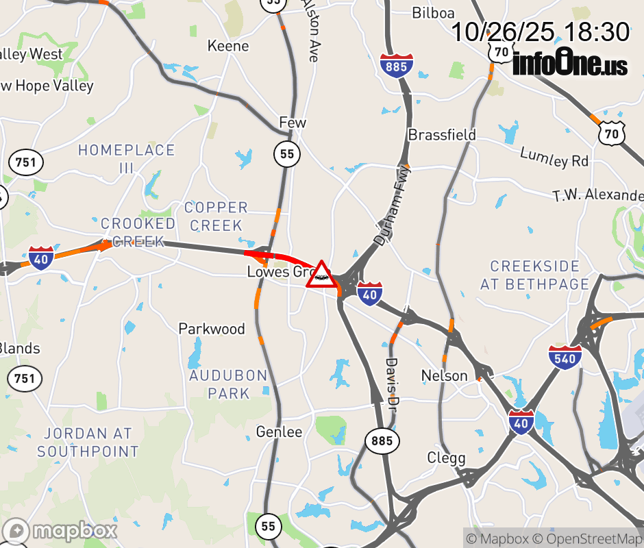The right shoulder is closed at Exit 279A (NC 885). Updated: Sun 10/26/25 6:30 PM EDT ![]() Updated: Sun 10/26/25 6:30 PM EDT |