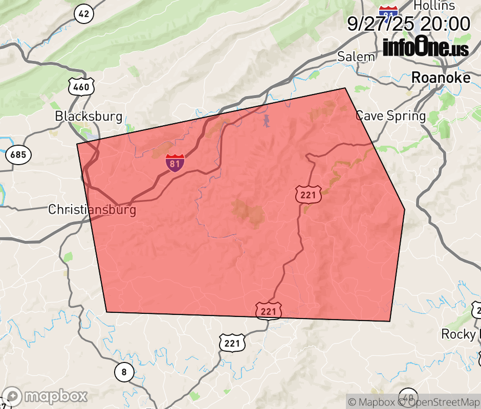 Canceled 9/27/25 8:30 PM Special Weather Statement issued September 27 at 7:58PM EDT by NWS Blacksburg VA At 758 PM EDT, Doppler radar was tracking a cluster of strong thunderstorms near Shawsville, moving east at 15 mph. HAZARD...Wind gusts up to 40 mph. SOURCE...Radar indicated. IMPACT...Gusty winds could knock down tree limbs and blow around unsecured objects. Locations impacted include... Blacksburg... Christiansburg... Pilot... Copper Hill... Shawsville... Bent Mountain... and Terrys Fork. ![]() |