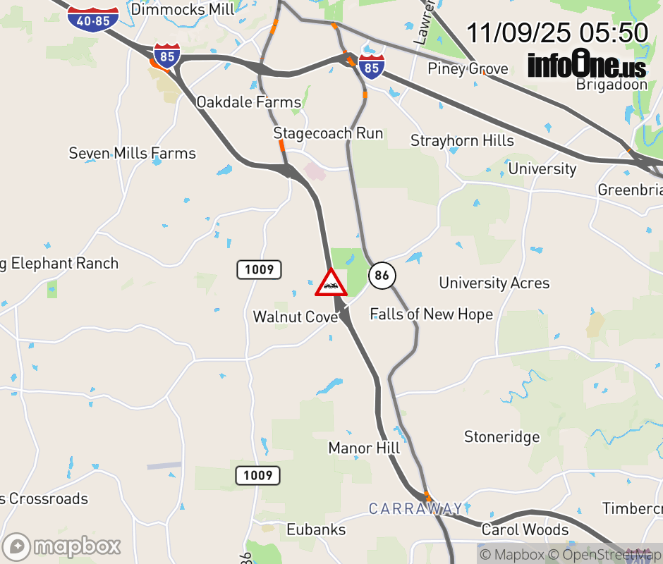 The right lane is closed past Exit 261 (Old NC 86). Updated: Sun 11/9/25 5:50 AM EST ![]() Updated: Sun 11/9/25 5:50 AM EST |