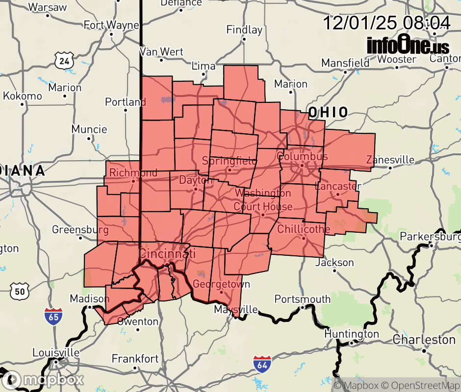 Canceled 12/1/25 11:24 AM Winter Weather Advisory issued December 1 at 8:02AM EST until December 2 at 10:00AM EST by NWS Wilmington OH * WHAT... Snow expected. Total snow accumulations of 2 to 4 inches. * WHERE... Portions of East Central and Southeast Indiana, Northern Kentucky and Central, South Central, Southwest and West Central Ohio. * WHEN... From 7 PM Monday to 10 AM EST Tuesday. * IMPACTS... Plan on slippery road conditions. The hazardous conditions will likely impact the Tuesday morning commute. ![]() |